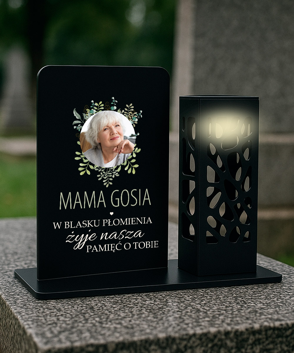 Znicz z dedykacją i fotografią Mamy + latarenka
