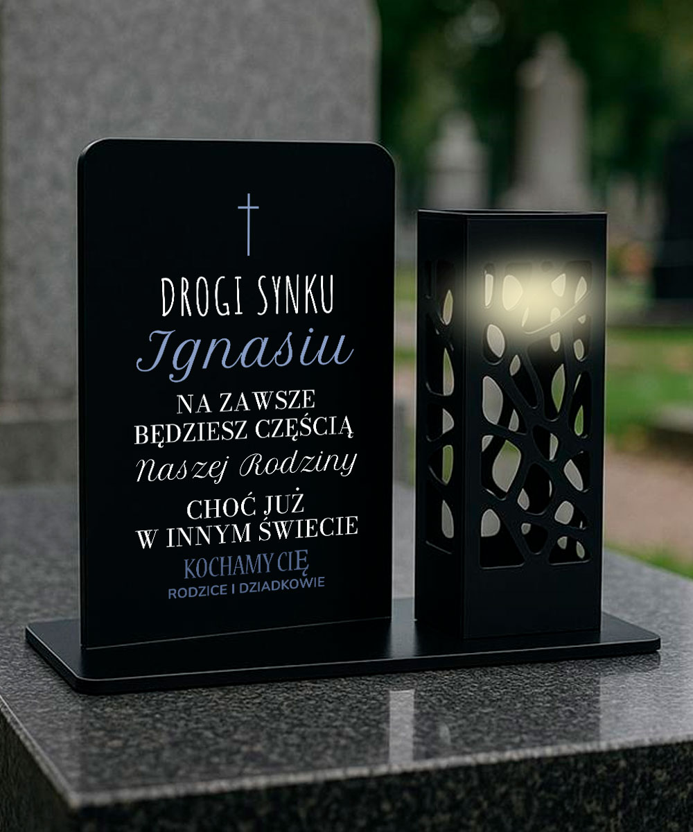 Znicz z latarenką i imieniem dla syna – dekoracja nagrobna na Wszystkich Świętych